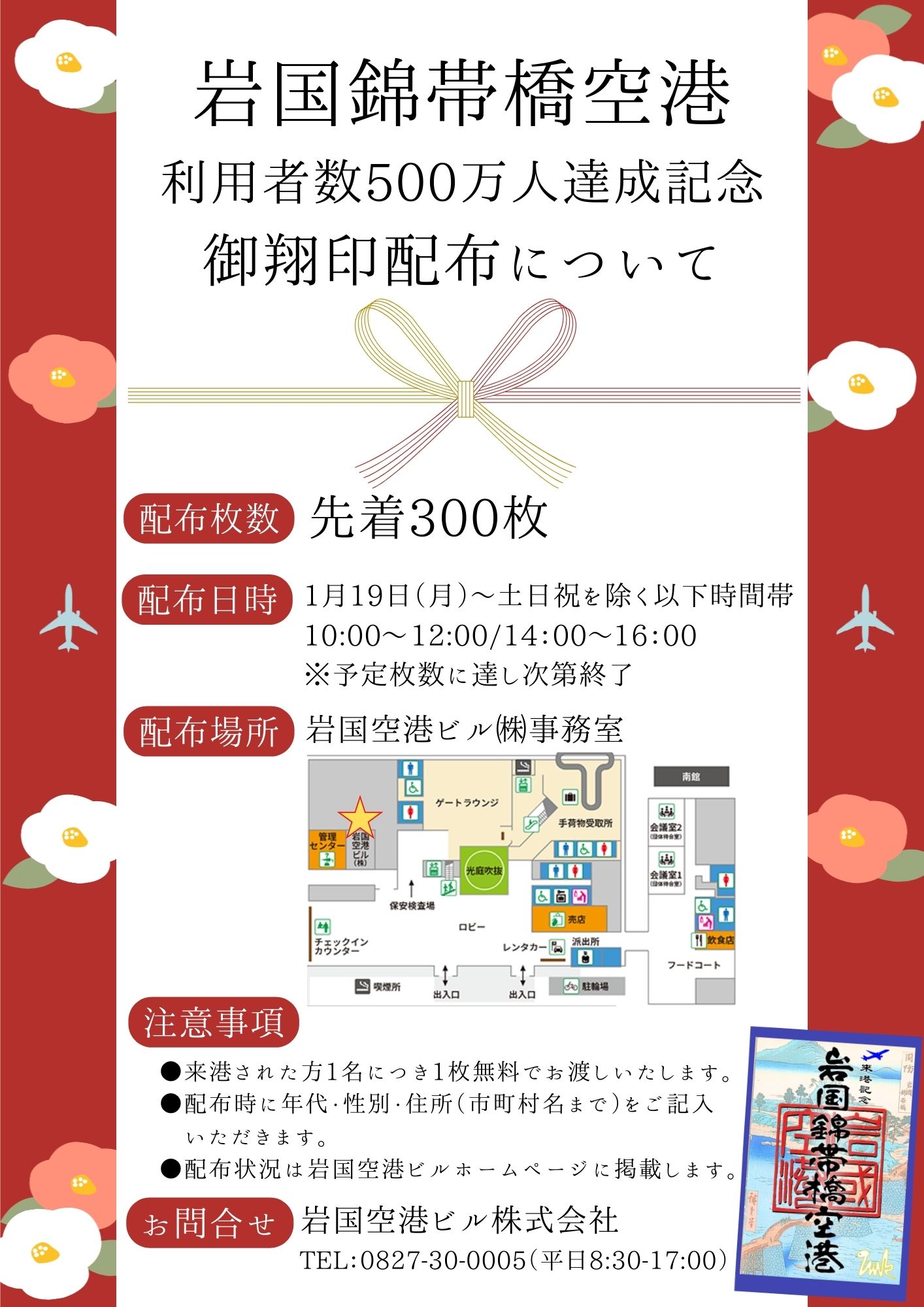 岩国錦帯橋空港 利用者数500万人達成を記念して「御翔印」を配布いたします。